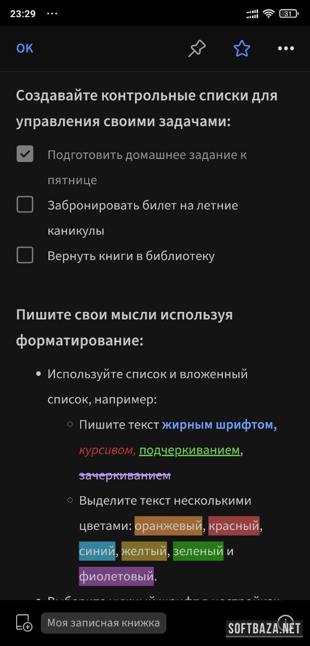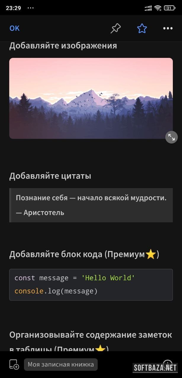 - Мультимедийный контент: Делайте ваши заметки живыми, добавляя в них изображения, видео, файлы вложения и гиперссылки.