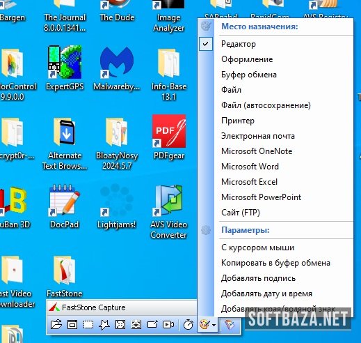FastStone Capture поддерживает все популярные графические форматы (PNG, JPG, BMP, TIFF, PDF) и предлагает multiple варианты сохранения и отправки результатов: