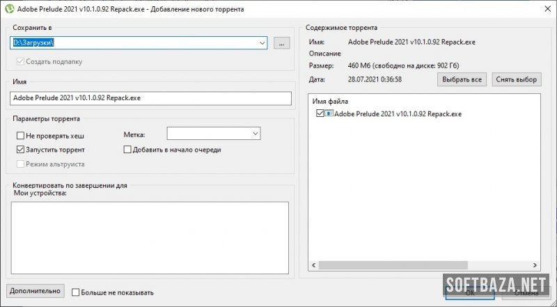 - Компьютер автоматически откроет установленный по умолчанию торрент-клиент и предложит начать загрузку;