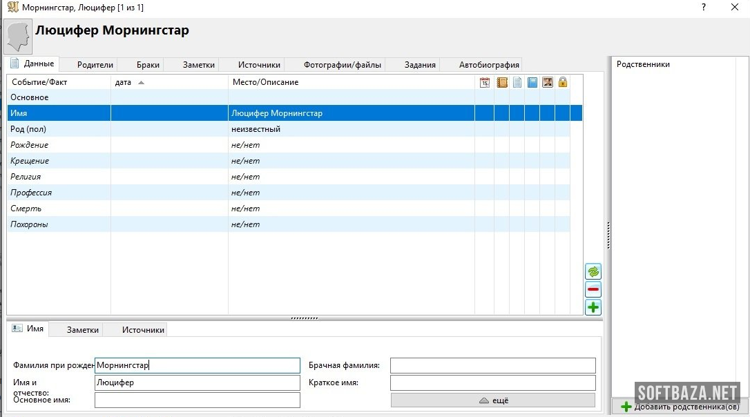 - Ведение подробной информации о каждом человеке: даты жизни, места проживания, профессии