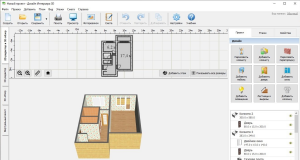 - Расстановка объектов — добавление мебели, окон, дверей из каталога