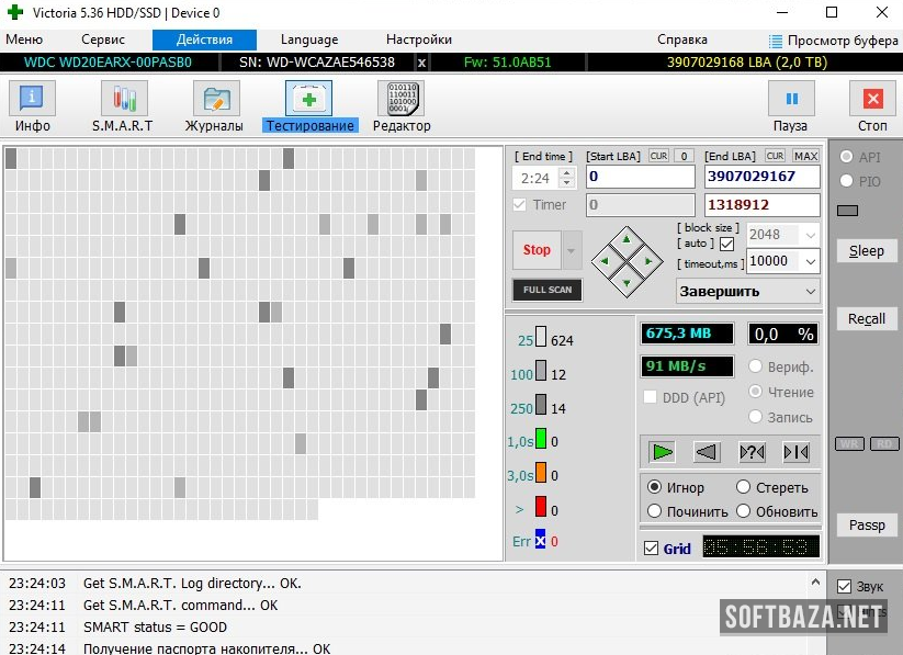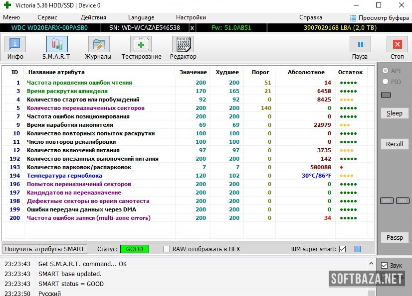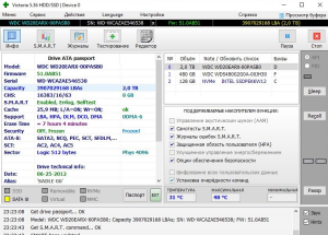 Программа осуществляет комплексный анализ накопителей через технологию S.M.A.R.T., отслеживая ключевые параметры работы диска. Victoria отображает текущую температуру устройства, общее время наработки, количество включений и другие критически важные показатели. Особенность утилиты — продвинутое сканирование поверхности накопителя на наличие битых секторов и ошибок чтения.