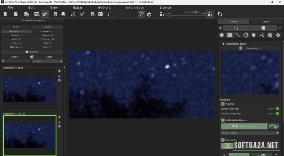 - Пакетная обработка, позволяющая применять настройки шумоподавления сразу к серии снимков.