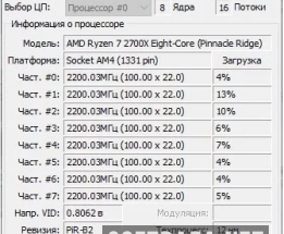 - Отображение детальных характеристик ЦПУ: модель, техпроцесс, частота, напряжение и сокет.