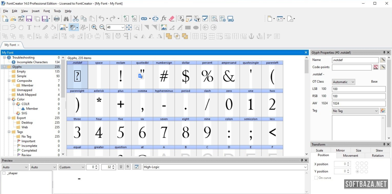 FontCreator Professional — уникальная платформа для разработки оригинальных шрифтовых гарнитур. Программа обеспечивает как создание совершенно новых типографических решений, так и модификацию существующих системных шрифтов с возможностью добавления дополнительных символов, интеграции поддержки кириллического или латинского алфавитов.Идеальный инструмент для графических дизайнеров и веб-разработчиков, стремящихся создать эксклюзивную типографику для своих проектов. В распоряжении пользователей находится полный профессиональный арсенал FontCreator, включая работу со шрифтами OpenType и TrueType, обработку векторной и растровой графики и множество других продвинутых функций.