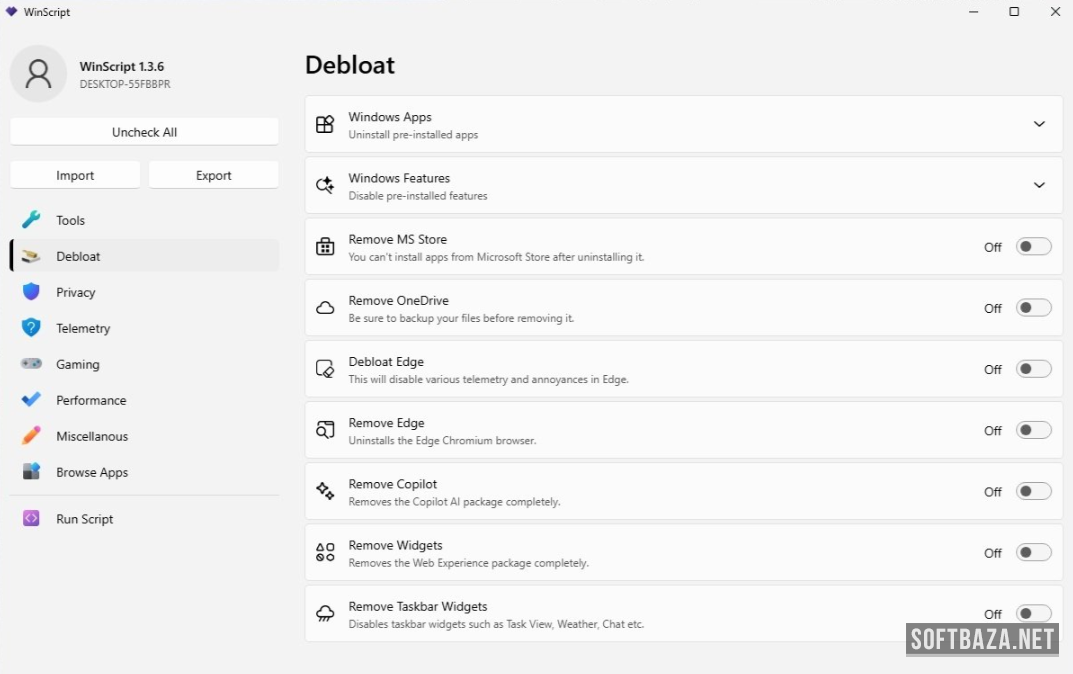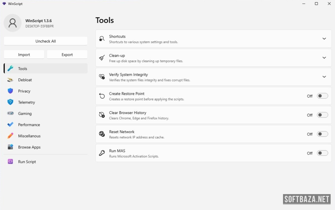 WinScript — мощная утилита-твикер для глубокой настройки операционных систем Windows 10 и 11. Программный комплекс аккумулирует обширный арсенал инструментов для конфигурирования параметров производительности, управления телеметрией, оптимизации системных компонентов и множества других аспектов функционирования ОС.Весь функциональный инструментарий WinScript логически структурирован по тематическим категориям и распределен между вкладками: Tools, Debloat, Privacy, Telemetry, Gaming, Performance, Miscellaneous, Browse Apps. В этих разделах сконцентрированы функции очистки истории веб-обозревателей, деактивации значительной части телеметрических модулей, оптимизации системных параметров для максимальной производительности в игровых приложениях.