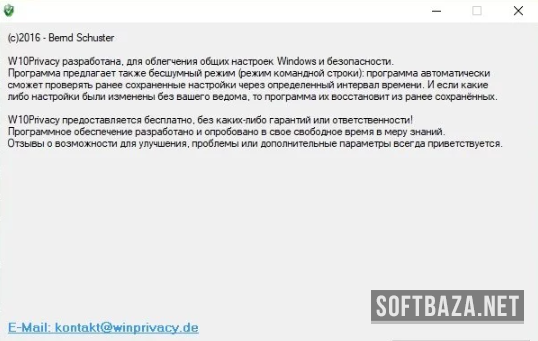 Утилита обеспечивает гранулярную настройку конкретных системных компонентов. Благодаря полной русификации W10Privacy процесс конфигурации необходимых параметров максимально упрощен и понятен. Уже активированные настройки маркируются галочкой в интерфейсе программы. Оптимально производить конфигурацию параметров безопасности непосредственно после установки свежей операционной системы на компьютер для максимальной защиты с первых минут эксплуатации. Утилита распространяется на безвозмездной основе и не требует ввода активационных ключей или лицензий.