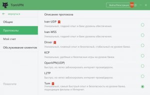 TomVPN включает поддержку использования многих алгоритмов шифрования данных на выбор пользователя. Среди них стоит выделить популярный OpenVPN, KCP, L2TP, Driver, Ivan-WSS, Ivan-UDP и некоторые другие. Подобные методы шифрования помогут повысить уровень анонимности и защиты при использовании общественных Wifi-сетей.
