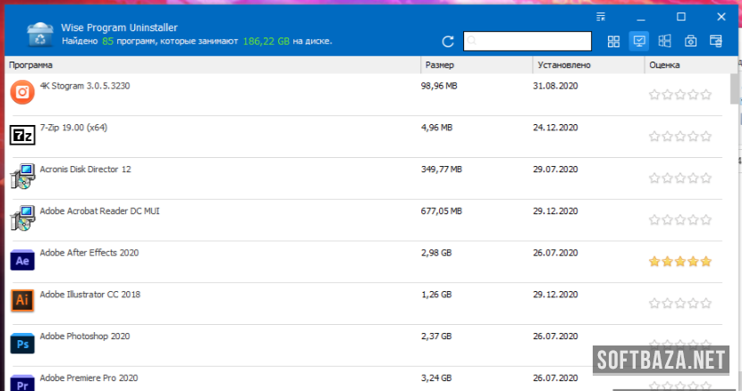 Интерфейс утилиты выдержан в максимально лаконичном стиле и не вызовет затруднений у пользователей любого уровня подготовки. В главном окне Wise Program Uninstaller отображается суммарное количество установленных приложений и их полный перечень с возможностью сортировки по дате инсталляции, наименованию, пользовательской оценке и занимаемому объёму.