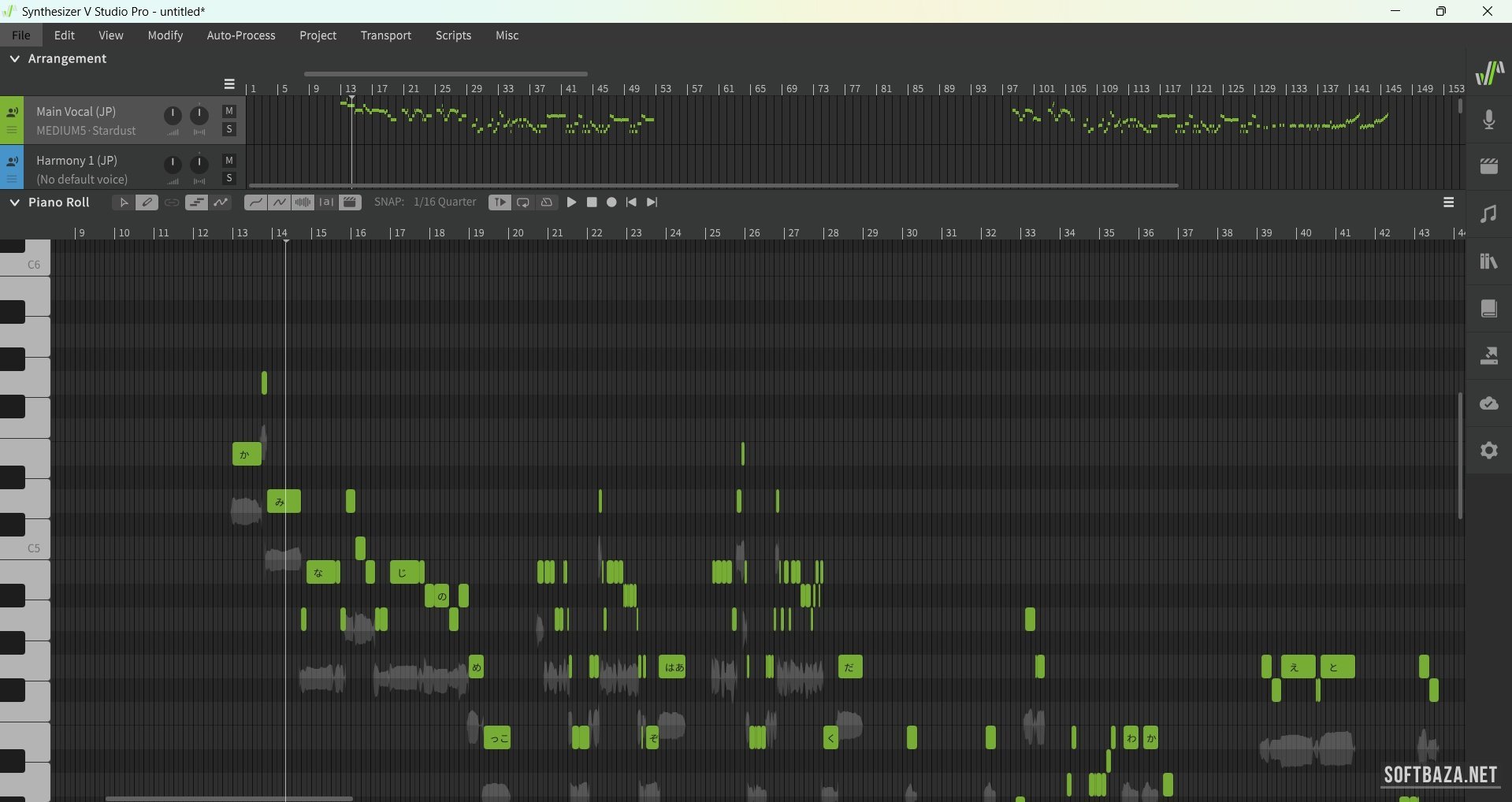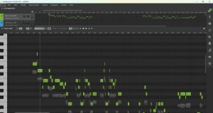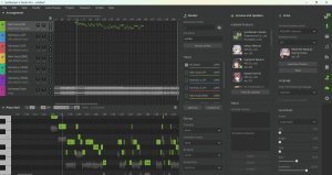 Центральная часть — это Piano Roll, расширенный редактор нот. Здесь вы рисуете ноты, вводите текст (фонемы), видите финальный рендер в виде питч-трека. В отличие от стандартного piano roll в DAW, здесь каждая нота — это контейнер с дополнительными свойствами: фонема, длительность гласной, параметры вибрато.