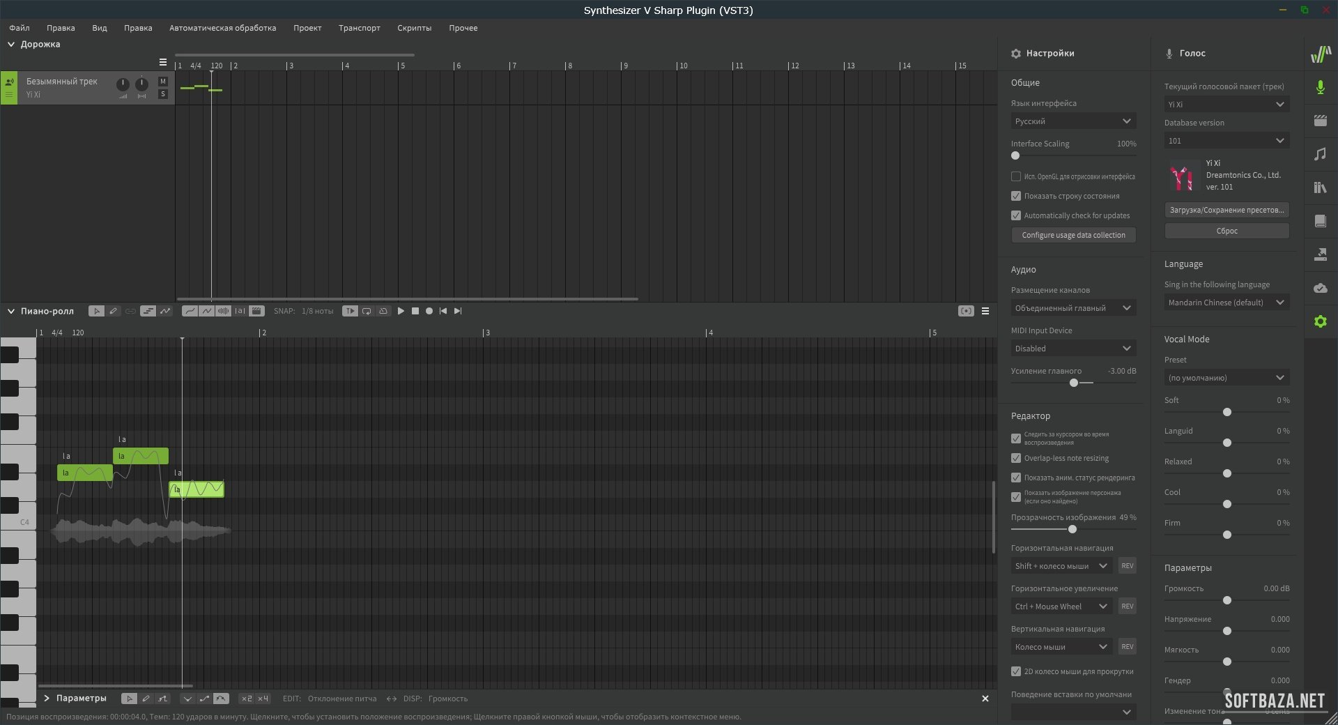 Слева от piano roll — Панель треков (Track Panel). В Basic-версии доступно 3 трека, в Pro — без ограничений. Каждый трек привязан к отдельному голосовому банку. Это позволяет делать полноценное многоголосие прямо внутри программы: дуэты, трёхголосные хоры, контрапункт.