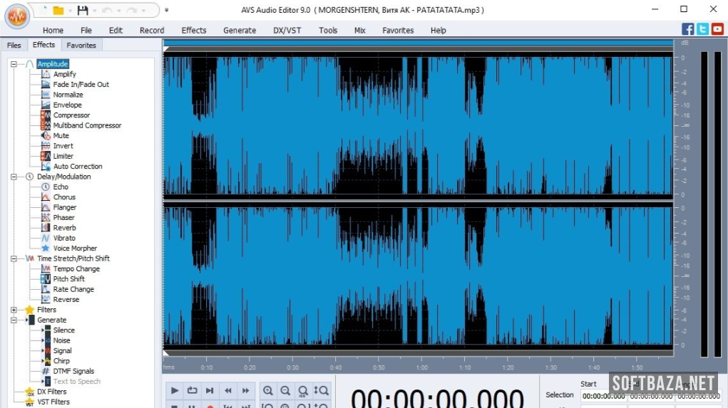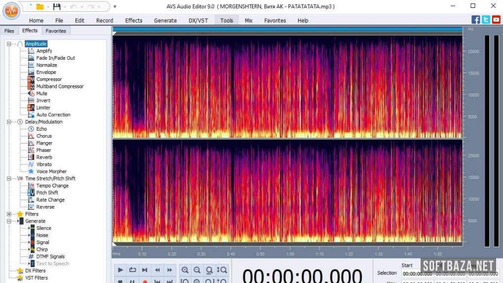 AVS Audio Editor включает богатую библиотеку эффектов — более 25 обработчиков. Это серьёзный арсенал для непрофессиональной программы: