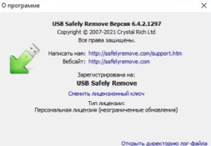 USB Safely Remove — это расширенный менеджер извлечения USB-устройств для Windows, разработанный российской компанией Crystal Rich Ltd. Программа заменяет стандартное системное уведомление «Безопасное извлечение устройства» и добавляет к нему десятки дополнительных возможностей: поиск и принудительное завершение блокирующих процессов, автозапуск программ при подключении/отключении устройств, горячие клавиши, переименование устройств и подробная статистика использования.
