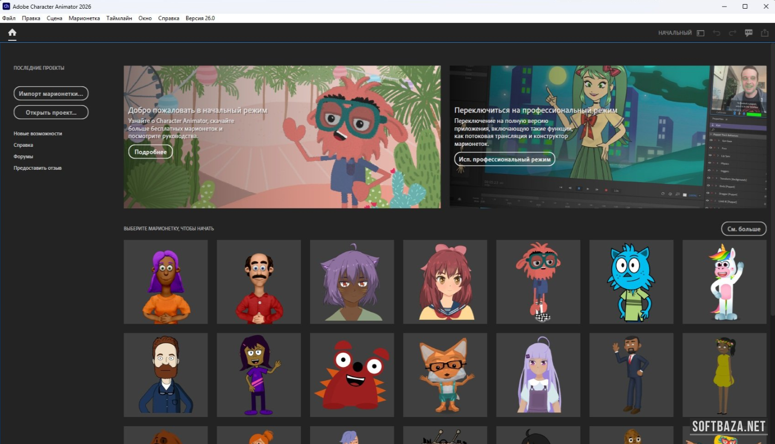 Перейдите на страницу Adobe Character Animator 26.0.0.50 на softbaza.ru. Выберите вашу платформу: Windows (64-bit) или macOS (Universal Binary / Intel). Размер установщика — около 1.8–2.5 ГБ.