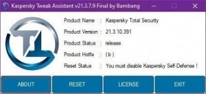 Kaspersky Tweak Assistant - это специальный бесплатный инструмент, разработанный для сброса пробного 30-ти дневного (trial) периода для большинства современных программных продуктов, выпускаемых Лабораторией Касперского. К ним можно отнести версии программ Kaspersky Free, Anti-Virus, Internet Security, Total Security, Security Cloud, Small Office Security и Endpoint Security, который выходили на рынок в период с 2019 по 2022 год.Стоит отметить, что данная утилита НЕ производит активацию программ Касперского, не использует ключи, файлы регистрации и прочие методы. Только сброс триал периода. Утилита является абсолютно бесплатной, размер ее крайне мал и не займет много дискового пространства. Интерфейс предоставляет минимум вариаций действий, по сути мы можем только посмотреть информацию о самой утилите, получить информацию о текущих лицензиях (с возможностью установки и сохранении), произвести сброс и выйти. Запутаться в ее работе невозможно. Если вы захотели скачать Kaspersky Tweak Assistant, то можете перейти по ссылке, которая размещена под описанием.