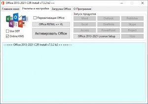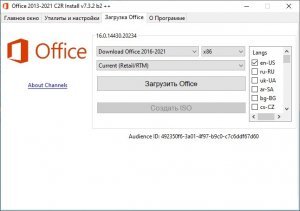 Office 2013-2021 C2R Install - утилита позволяющая получить требуемую версию офисных приложений от Microsoft. Использует исключительно официальные источники и дистрибутивы, а также имеет ряд дополнительных инструментов для инсталляции Office на компьютер.Программа поддерживает скачивание и инсталляцию современных сборок Office 2013, 2016, 2019 и 2021 с официального сервера Microsoft. Главное преимущество утилиты заключается в том, что она позволяет проводить установку отдельных компонентов MS Office (Word, Excel, PowerPoint, Visio, Access, OneNote и др.).